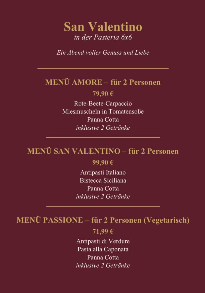 Verwöhnen Sie Ihren Lieblingsmenschen mit einem gemütlichen, intimen kulinarischen Erlebnis voller echter Aromen Italiens. Reservieren Sie Ihren Tisch und machen Sie diesen Valentinstag bei Pasteria 6×6 zu etwas ganz Besonderem.
