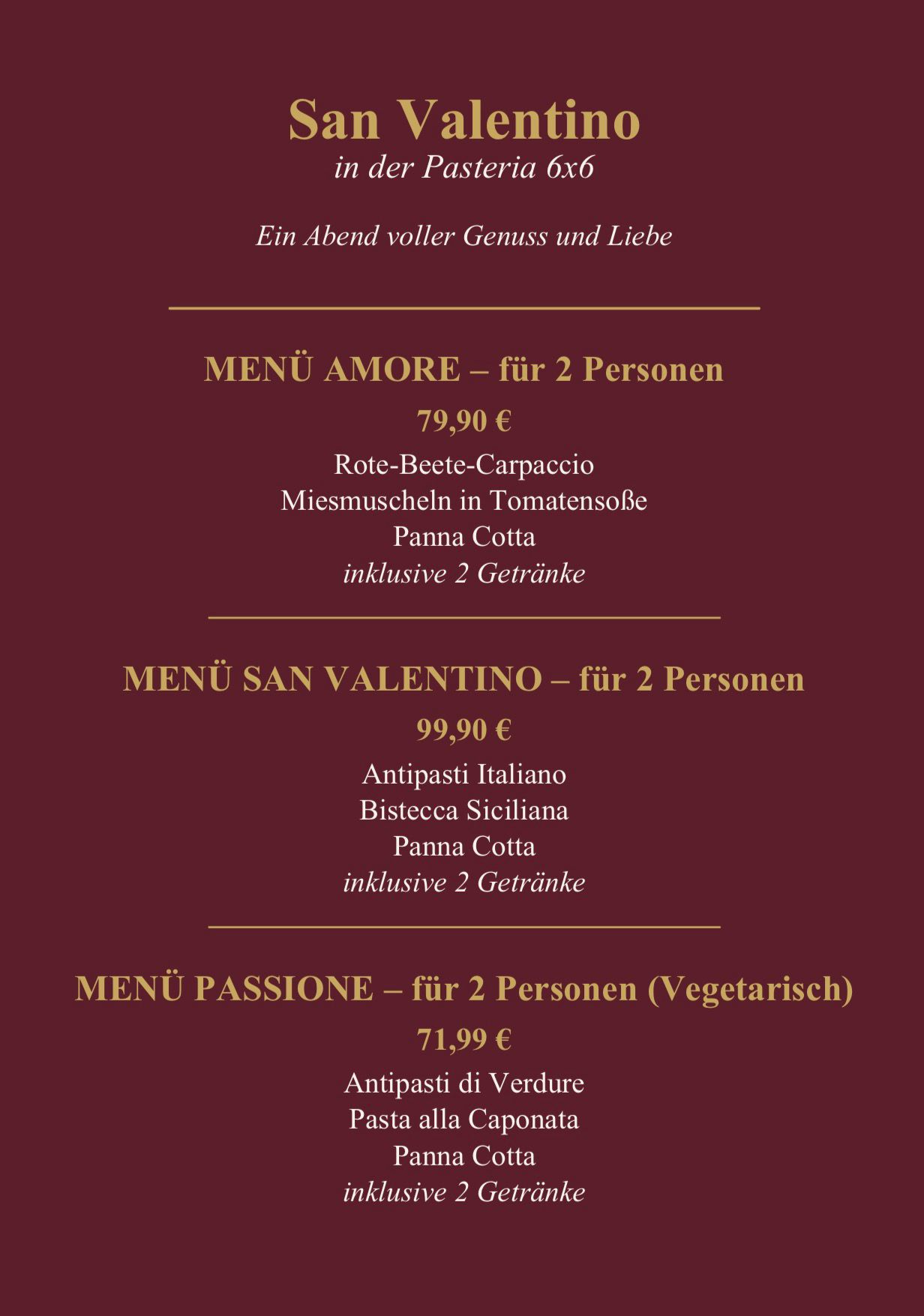 Feiern Sie die Liebe mit einem unvergesslichen Abend voller authentischer italienischer Küche in einer warmen und romantischen Atmosphäre. Genießen Sie ein speziell zusammengestelltes Valentinstagsmenü mit köstlichen Vorspeisen, frisch zubereiteter Pasta und Pizza sowie unwiderstehlichen Desserts – alles mit Leidenschaft und den besten Zutaten zubereitet.
